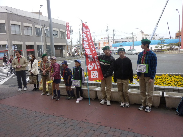 4月3日中村公園前で東日本大震災の募金をカブ隊、ボーイ隊と合同で実施しました。思ったより人出が少ない割には皆さん募金に協力してくれました。(カブ、ボーイ隊コーナーにも掲載)