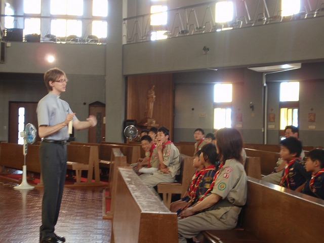 傍で見ている班長は真剣です。同じに見えても今までとずいぶん違った新型テントなのです。(キャンプ地で他の班に負けないように覚えておかなければ・・・)テントデビューは8月の長期キャンプです。