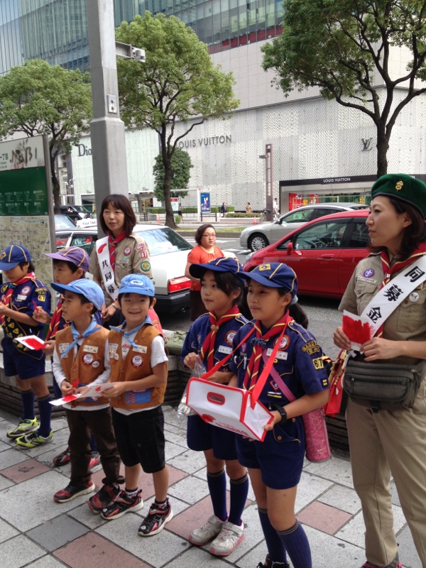大きな声で募金活動!ビーバーちゃんと一緒です
