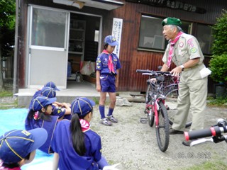 6月3日、サイクリングを行う前に、団委員長より自転車の部品について
